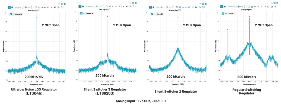 图10.在提供AVDD1的不同电源(超低噪声LDO稳压器、Silent Switcher 3稳压器、Silent Switcher 2稳压器和常规开关稳压器)下,ADC输出信号的平均FFT结果。