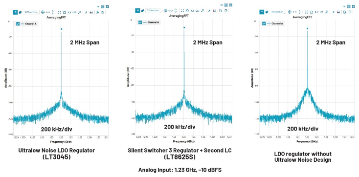 ADC系统性能对采样时钟信号的质量(即相位噪声)十分敏感。在约250 kHz处的平台区,与ADF4372输出信号相位噪声图(图3中的绿色曲线)中相同频率处的小尖峰高度吻合。正如PLL案例研究中所揭示的那样,相位噪声图中的这种小杂散信号可以通过添加滤波器来消除。因此,将Silent Switcher 3稳压器用作时钟电源时,通过添加第二级LC滤波器能够提升ADC的性能,而这一点也得到了实验结果的证实。图9呈现了在采用图4中设计的第二级LC滤波器的Silent Switcher 3解决方案下,ADC输出信号的FFT结果。ADC输出的最终FFT波形在主信号1.23 GHz附近呈现出极低的噪声,这几乎与超低噪声LDO稳压器的结果相同。不出所料,图9还表明,在频率偏移小于100 kHz的情况下,配备了第二级LC滤波器的Silent Switcher 3稳压器的FFT结果优于未采用超低噪声设计的LDO 稳压器的FFT结果,这是因为其低频噪声更低,进而使得PLL时钟信号的相位噪声也更低。