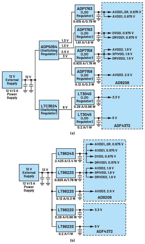 图11.ADC系统的原始电源树与新型电源树(AD9208 + ADF4372)对比:(a) 原始电源树(降压式稳压器与LDO稳压器组合而成的两级解决方案);(b) 新型电源树(基于Silent Switcher 3技术的单级解决方案)。