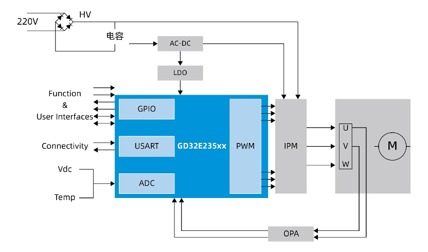 基于GD32E235系列MCU的洗衣机变频驱动应用框图