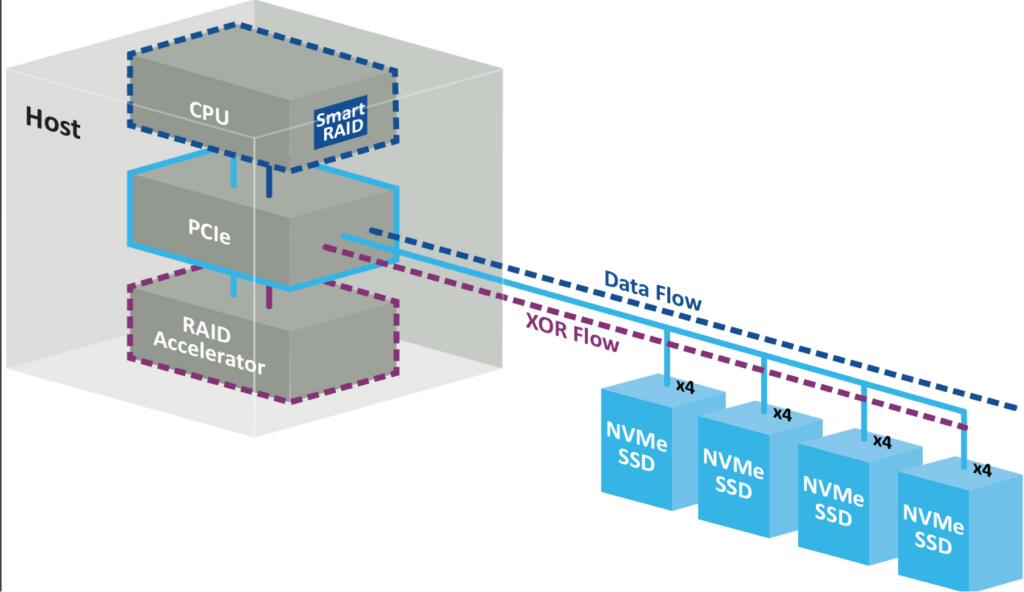 智能存储软件在主机CPU上运行,可实现I/O数据流的性能最大化:写入操作直接从主机CPU以各自PCIe代际速率传输到NVMe端点设备,同时基于奇偶校验的冗余计算(XOR)则从主机CPU卸载到加速器硬件执行。此架构克服了传统内联式(in-line)存储解决方案固有的瓶颈,有助于SmartRAID 4300加速器实现高度的可扩展性与灵活性,并支持第4代和第5代PCIe主机CPU,可连接多达32个 CPU直连的x4 NVMe设备和64个逻辑驱动器或RAID阵列。