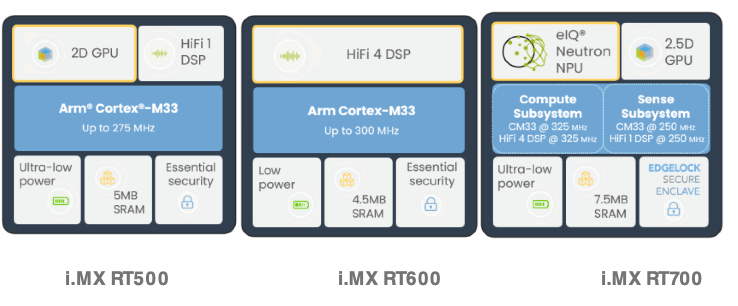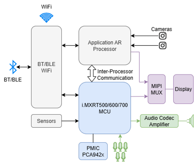 i.MX RT500、i.MX RT600和i.MX RT700是恩智浦i.MX RT低功耗产品系列的三款芯片。这些芯片作为协处理器,目前被广泛应用于全球多家客户的创新 AI 眼镜设计中。