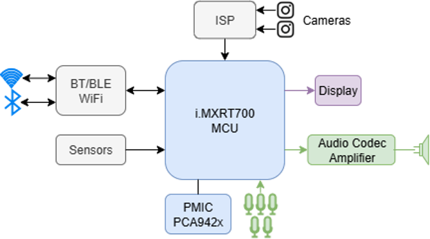 作为AI眼镜中的协处理器,i.MX RT700能够基于不同的应用场景,通过灵活配置电源管理和时钟域,实现角色切换:既可作为高性能多媒体数据处理的AI计算单元,也可在超低功耗状态下,作为语音输入传感器枢纽(Sensor Hub)进行数据处理。