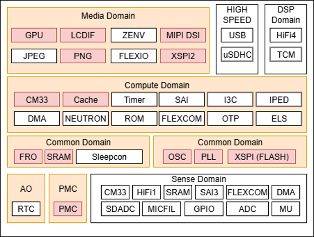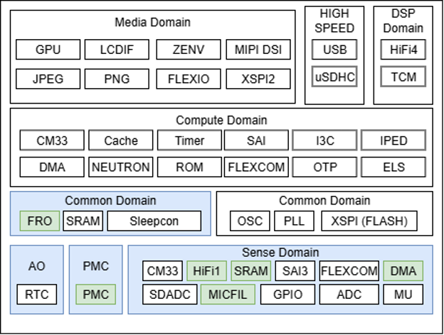 i.MX RT700在低功耗设计方面实现了进一步优化,其动态功耗相比i.MX RT600降低了45%,而静态功耗仅为i.MX RT600的20%。i.MX RT700通过“精细化分区设计”实现功耗优化,片上系统分成了主计算区域(main compute domain)、传感器计算区域(sense compute domain)、媒体区域(media domain)、 电源控制区域、共享区域、DSP区域及常开区域(Always-on domain)。这些区域均可通过电源开关实现独立的开启与关闭,部分区域还可根据运算频率的变化动态调节电压,实现性能与能耗的最优平衡。