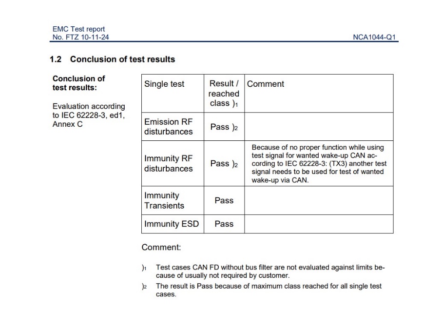 NCA1044-Q1此前也已通过权威欧洲机构 IBEE/FTZ-Zwickau EMC认证(且通过大众VW80121-3, 2023-12企业EMC标准),IBEE/FTZ-Zwickau认证根据IEC62228-3标准进行,聚焦CAN收发器本身的EMC特性,要求等级极高,在除欧洲以外的车企中也得到了广泛参考应用。