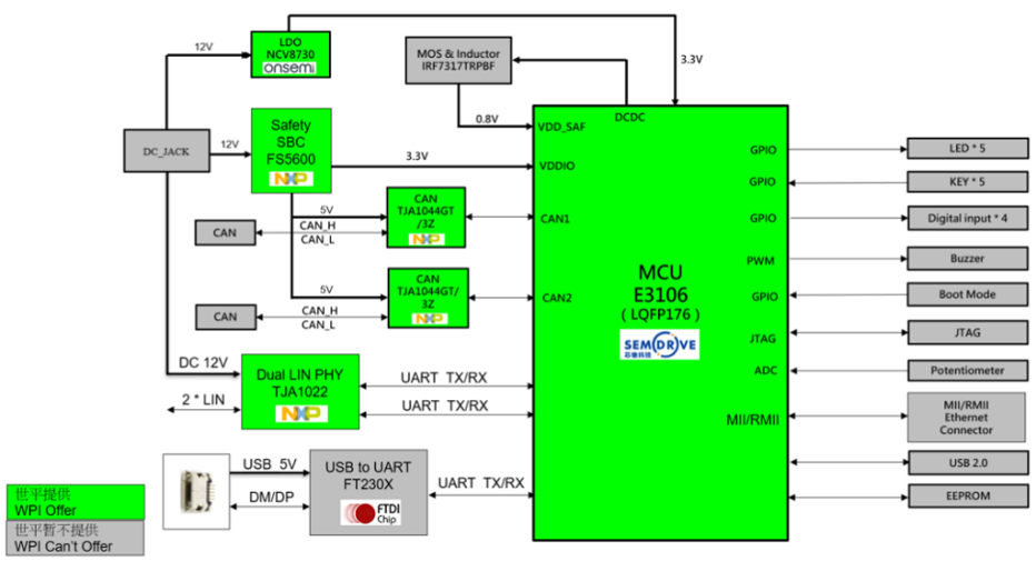 - 提供RMII接口,可弹性对接车用以太网和工业用以太网的开发板,实现车用网络开发;