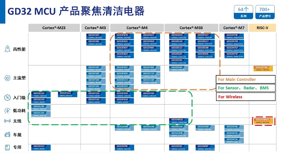 作为全球十大32位通用MCU厂商,兆易创新针对清洁电器行业需求构建了丰富的产品矩阵。按内核算力划分,其产品覆盖M4至M33内核,主频约150MHz。考虑到三角激光、dToF、线激光雷达等在清洁产品中应用广泛且成本要求苛刻,兆易创新在入门级低成本产品上实现突破,旗下GD32E235系列、GD32F31x系列、GD32W515系列均已在此领域落地成熟应用。此外,针对智能化产品对无线功能的核心需求,兆易创新也同步提供了相应产品。