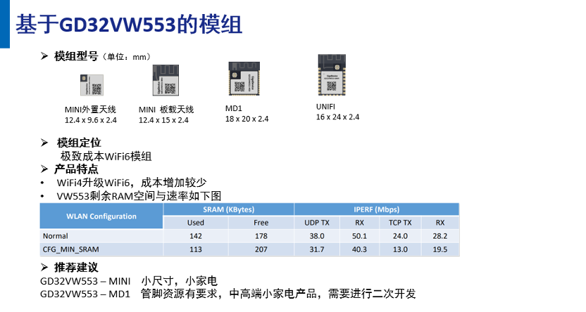 兆易创新有几款产品已经在行业中得到了广泛的应用。其中,GD32VW553双模无线MCU支持Wi-Fi 6与BLE 5.2,具备丰富IO资源,可完美适配洗地机应用。该芯片采用RISC-V内核,主频达160MHz,最高支持4MB Flash与320KB SRAM,还集成CAU、HAU、TRNG、CRC、ECC、EFUSE等安全模块,保障数据安全。兆易创新同步推出了基于此芯片的四款模组,定位“极致成本Wi-Fi 6模组”,进一步降低客户应用门槛。