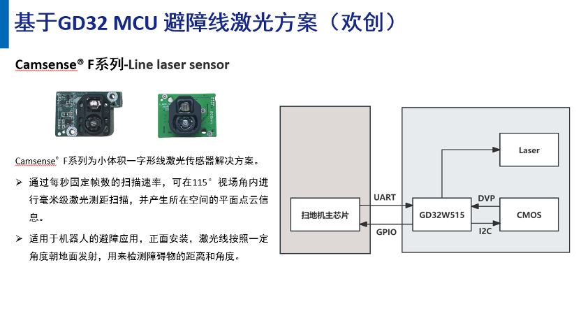 第二款是与合作伙伴欢创联合开发的避障线激光方案,以GD32W515芯片为核心,可同时兼容CMOS与激光传感器。该方案能以固定每秒帧数的扫描速率,在115°视场角内实现毫米级激光测距扫描,并生成空间平面点云信息,为清洁设备避障提供精准数据支持。