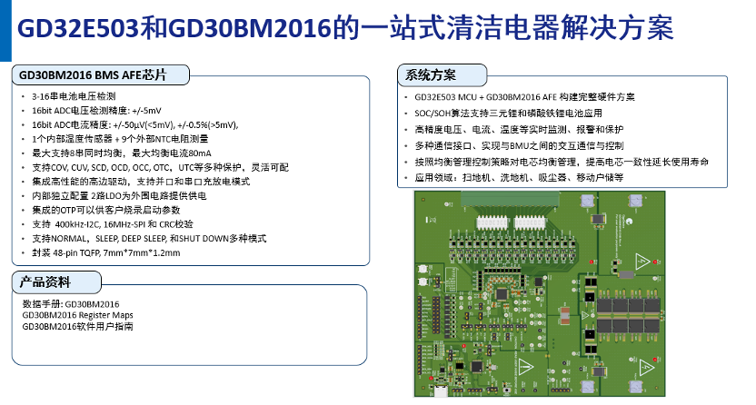 第三款为一站式清洁电器解决方案,由GD32E503 MCU与GD30BM2016 BMS AFE芯片构建完整硬件架构。其中,GD30BM2016 BMS AFE芯片功能强大,支持3-16串电池电压检测;16bit ADC电压检测精度达±5mV;内置1个温度传感器且可外接9个NTC电阻测温;最大支持8串同时均衡,最大均衡电流80mA;支持COV,CUV,SCD等多种保护;集成高性能的高边驱动,支持并口和串口充放电模式。整套方案支持三元锂与磷酸铁锂电池的SOC/SOH算法,具备电压、电流、温度等参数的实时监测、报警及保护功能,拥有多种通信接口以实现与BMU的交互控制,还能依据均衡管理策略对电芯进行均衡管理,提升电芯一致性并延长使用寿命。该方案可用于扫地机、洗地机、吸尘器、移动户储中。