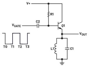 要了解此电路的工作原理,假设LC谐振电路的Q值足够高,能够防止阻尼。当输入门控脉冲呈负跳变时(T0到T1和T2到T3期间),电路会产生输出。其余时间(T1到T2)晶体管深度导通,电路无输出。输入门控脉冲的宽度用于控制输出信号的持续时间。门控脉冲越宽,输出振荡或振铃的时间越长。