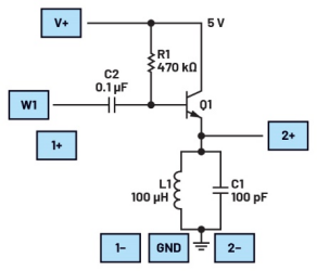 脉冲振荡器有多种类型,适用于不同的应用场景。图1所示为发射极负载式脉冲振荡器的原理图。谐振电路也可以放在集电极中,这种情况称为集电极负载式脉冲振荡器。发射极负载式振荡器和集电极负载式振荡器的区别在于输出信号。发射极负载式NPN脉冲振荡器的第一个周期是负周期。集电极负载式脉冲振荡器的第一个周期是正周期。如果使用PNP,则发射极负载式振荡器和集电极负载式振荡器的第一个周期均会反向。