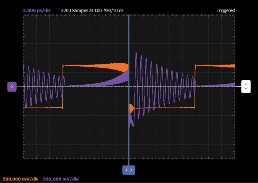 请注意,输出正弦波以地(0 V)为中心,在正负方向上摆动。测量输出正弦波的频率。测量输出正弦波脉冲的第一个和最后一个周期的峰峰值幅度。从脉冲开始到结束,幅度下降了多少?