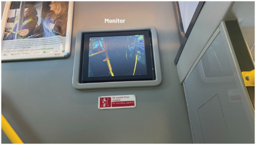 图2还展示了安装在驾驶座上方的摄像头(用于监控驾驶员行为),以及安装在驾驶舱前门处的摄像头(用于监控前门和过道)。同样,车厢内车门上方也装有摄像头,用于监控客流情况,为驾驶员判断关门时机提供依据(图3)。监视器/屏幕通常安装在驾驶座附近,方便驾驶员查看。监视器不仅提供与DVR及整个车载安全系统的交互界面,还能实时显示各个位置摄像头回传的实时画面,以便驾驶员更好地做出判断。