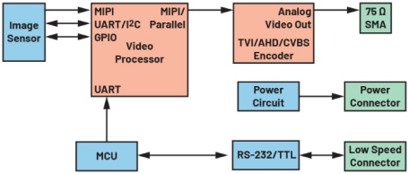 处理完成后,输出信号被传送至TVI/AHD/CVBS编码器,将处理后的信号编码为适用于传统视频传输方案的标准视频格式,并通过75 Ω SMA连接器传输。