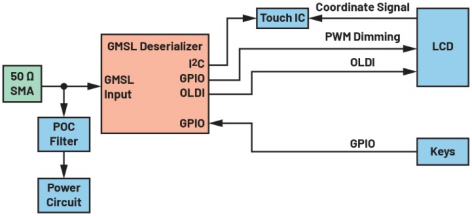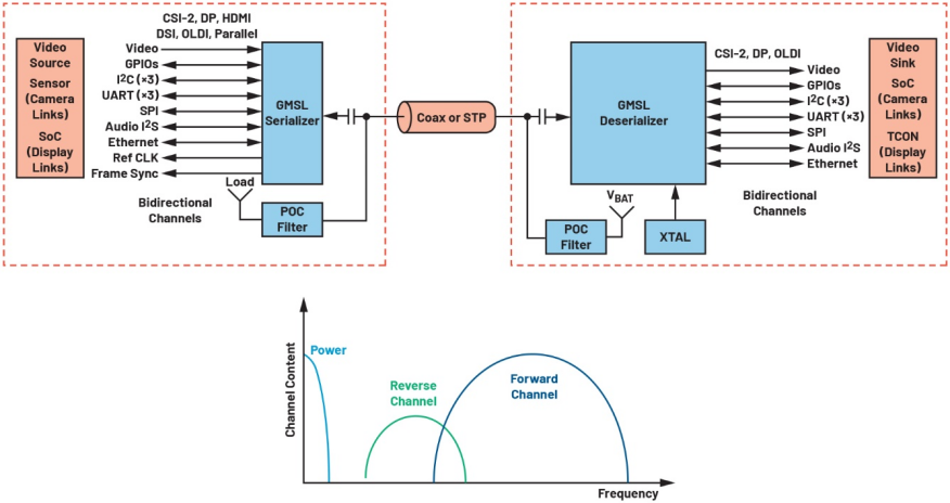 从图13和图15可见,GMSL SERDES的视频接口和控制接口直接与图像传感器和LCD面板相连,省去了微控制器(MCU)、视频编解码器、RS-485/RS-232收发器及其他连接器。此外,GMSL SERDES解决方案还具备多项优势:更大的视频带宽、超低且确定性的视频延迟、极为简化的硬件设计,而且仅需一根低成本同轴电缆或屏蔽双绞线(STP)就能实现外部连接。