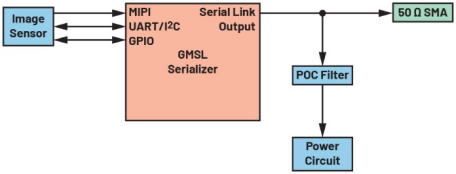 与图6和图7相比,GMSL SERDES解决方案大幅减少了摄像头模块所需的元器件数量。GMSL SERDES能够同时双向传输I2C/UART/SPI/GPIO信号,使SoC可通过GMSL访问远程图像传感器的其他外设,例如惯性测量单元(IMU)、G传感器、LED控制器以及其他水平旋转/垂直倾斜/变焦(PTZ)控制信号。GPIO的延迟达到微秒级,用户因而能够通过GPIO触发单帧图像采集。GMSL摄像头的外部接口仅需一根50 Ω同轴电缆或一对屏蔽双绞线。