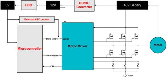 - 电源电压测量不准确,响应时间更慢。分立式制动实施方案通常会受到电池端检测电压与 MOSFET 漏极测量电压不准确的影响。此外,负责发出制动信号的微控制器 (MCU) 对数据进行采样和解码可能会导致系统响应延迟,这在紧急情况下会带来危险。