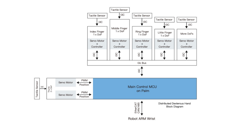 在采用分布式电气架构的灵巧手设计之中,负责每个主动自由度的电机驱动,以及分布在每个手指的触觉传感器,需要通过UART或CAN接口与手掌中央主控MCU通信。主控MCU通过CAN、RS485、EtherCAT接口接入机器人本体系统总线。这种架构存在几个痛点,在一定程度上制约了灵巧手系统的性能提升、架构演进和轻量化小型化的发展。