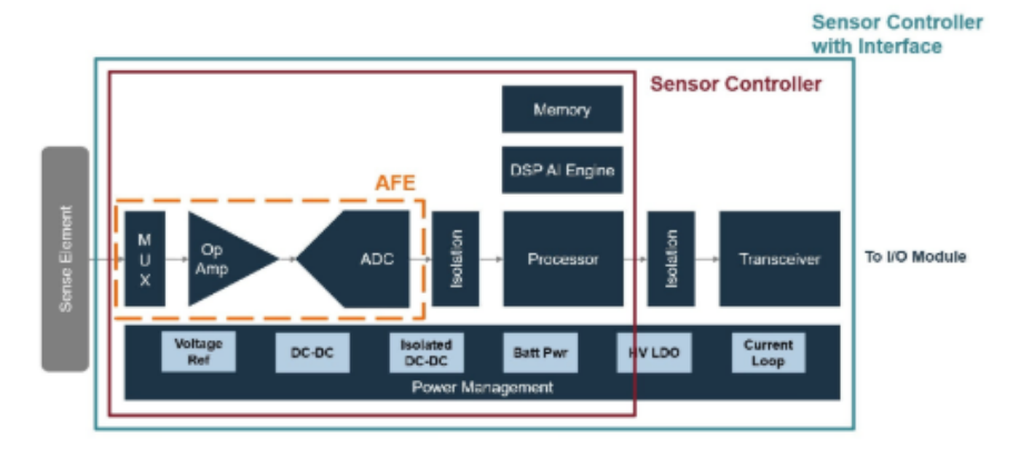 为了构建传感器,系统设计人员将使用现成的 IC 来实现运算放大器 (Op-Amp)、电压基准、模数转换器 (ADC)、电源管理、中央处理器 (CPU)、接口和系统功能,这些 IC 与传感元件协同工作,将模拟信号数字化、处理数据并通过 I/O 模块将数据传送至可编程逻辑控制器 (PLC)。在一些过程自动化应用中,传感器有时还需在 ADC 与 CPU 之间、或 CPU 与接口之间施加可选的电隔离。