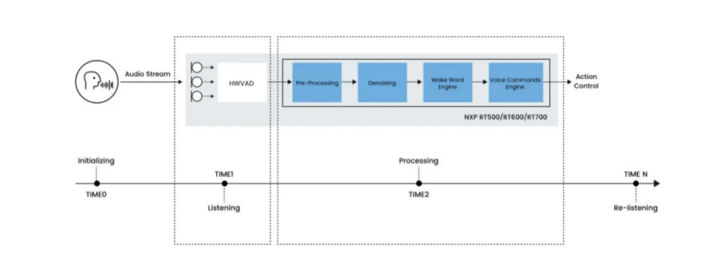 监听阶段可仅保留感知域中的DMA和MICFIL (PDM Microphone Interface) 以较低的频率工作。MICFIL包含HWVAD (Hardware Voice Activity Detector) 功能,从硬件层面检测语音活动。