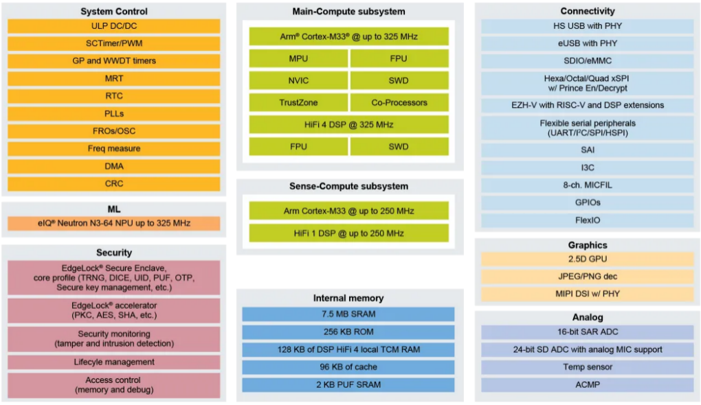 i.MX RT700配备了HiFi4/HiFi1 DSP, 专注于音频处理,可通过专用音频指令集 + 硬件通路持续处理高速数据流。除此之外,HiFi4 DSP也是一颗性能强劲的通用处理核心,可以运行复杂的任务。
