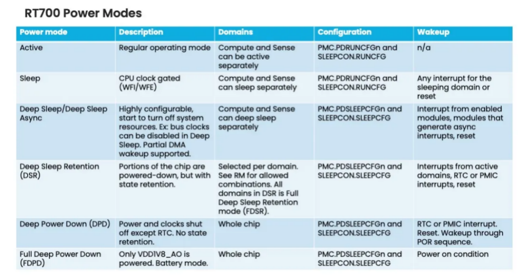 此外,i.MX RT700还配备多种低功耗模式,如下表所示: