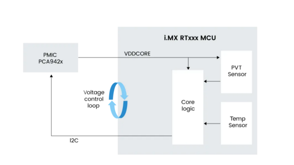 除此之外,i.MX RT700芯片内置了PVT传感器 (Process, Voltage, Temperature),它可以提供一种针对不同芯片动态调压的方案。芯片在运行过程中会受到制造工艺差异、电压波动和温度变化的影响。PVT传感器实时监测这些因素,并通过延迟线结构判断当前供电电压是否足以支撑逻辑运算。如果电压过低,它会触发报警,提示系统提升电压;如果条件允许,系统则可以逐步降低电压,直到找到当前环境下的“最低可用电压”。
