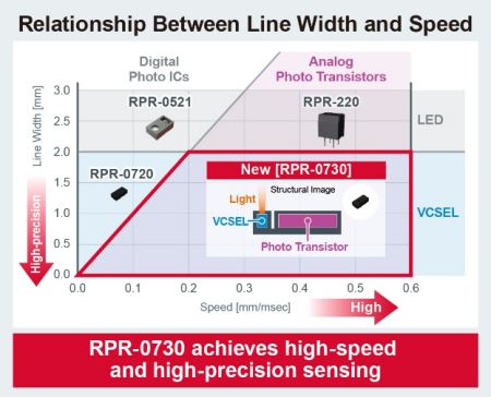 随着工业设备和办公设备向更高性能、更多功能及更智能化方向发展,对感测技术的精度提升提出了更高要求,特别是标签打印机、样本传送装置和复印机等应用,除了通过优化生产工艺等提升速度外,还需要具备能够更精准识别目标物的技术,因此引入高速且高精度的接近传感器变得至关重要。为应对这些需求,ROHM推出采用VCSEL作为发光元件、采用光电晶体管作为受光元件的模拟量接近传感器“RPR-0730”。该产品能够高速且高精度地感测传统LED光源难以识别的微细目标物。