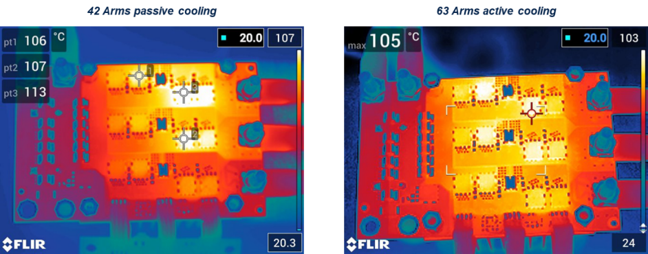 在常规组装状态下,MOSFET器件不可见。为检测其实际温度,我们采用定制线缆将功率板与控制板重新布置为共面并列结构。通过热像仪拍摄功率板温度分布:初始测试关闭风扇,电机以42A(有效值)正弦电流运行,在25℃环境温度下约15分钟达到热平衡状态。板面最高温度点出现在低侧MOSFET,达到113℃(图4左)。随后开启风扇并将输出电流提升至63A(有效值),相同最热MOSFET的最高温度降至105℃(图4右),这得益于强制气流使板卡至环境的热阻显著降低。需说明的是,当两块电路板堆叠安装时,预计最高温度将高于本次测试值,但STL160N10F8器件允许的结温高达175℃,仍能确保驱动器在全功率运行时的设计裕量与安全可靠性。