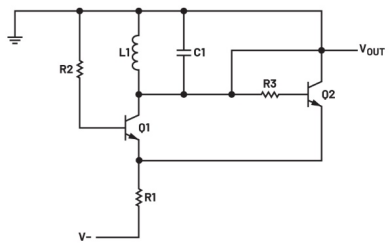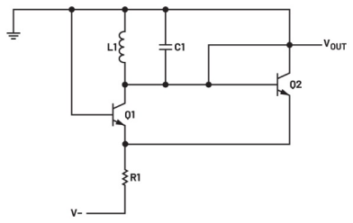 不同于采用单个晶体管的Clapp、Colpitts和Hartley振荡器,Peltz配置使用两个晶体管。观察图1,注意晶体管Q1配置为共基极放大器级。由L1和C1组成的谐振电路提供集电极负载。集电极的输出馈送到晶体管Q2的基极。Q2配置为射极跟随器(共集电极)级。当射极跟随器(Q2发射极)的输出连接回Q1发射极处的共基极级输入时,形成振荡所需的正反馈。共基极放大器级的电压增益在LC谐振电路的并联谐振频率处达到最大值,此时其阻抗接近无穷大。射极跟随器的增益总是略小于1。环路周围的组合增益在谐振时将远大于1,以维持振荡。