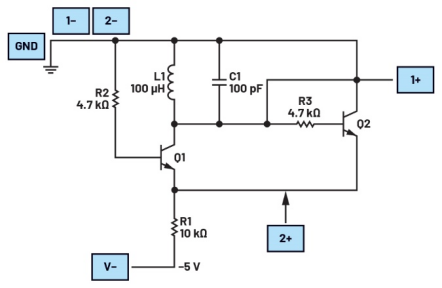 构建图1和图2所示Peltz振荡器的仿真原理图。计算偏置电阻R1的值,使得晶体管Q1和Q2中的集电极电流均大于200 µA。假设电路采用-5 V电源供电。计算C1和L1的值,使得谐振频率至少为1 MHz。执行瞬态仿真。LC谐振电路的峰峰值输出摆幅应限制在±1个二极管正向压降(~±0.6 V)以内。计算并模拟R2 = R3时的阻值,使得输出摆幅提高到至少±1.25 V。保存这些结果以与实际电路的测量结果进行比较,并记录在实验报告中。