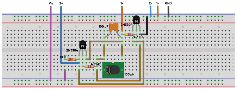 在无焊试验板上构建图3所示的Peltz振荡器电路。方块表示连接ADALM2000模块示波器通道和电源的位置。务必反复检查接线之后,再打开电源。