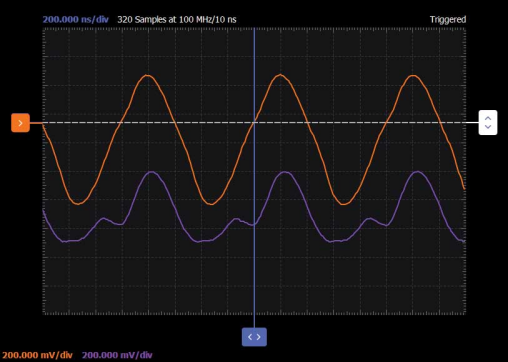 将两个示波器输入均设置为200 mV/div,并将时基设置为1 µs/div。将触发信号设置为通道1的上升沿。参见图4所示的试验板电路。