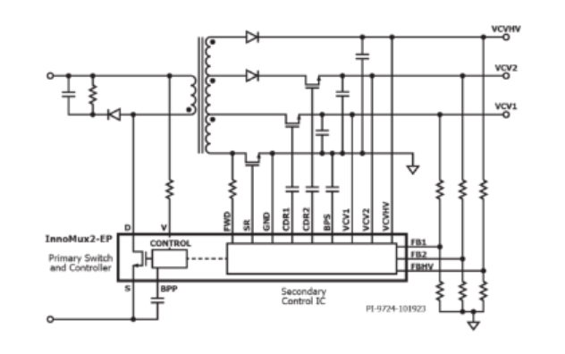 不仅如此,该器件采用PI高散热效率的InSOP™24和InSOP™28封装,并结合PCB冷却功能,因此无需额外使用散热片。在电源输出方面,InnoMux™-2提供双输出和三输出定电压(CV)选项,并且其中一个输出可专用于定电流(CC)驱动,非常适合为监测器中的LED供电或用于内部电池的高速充电。