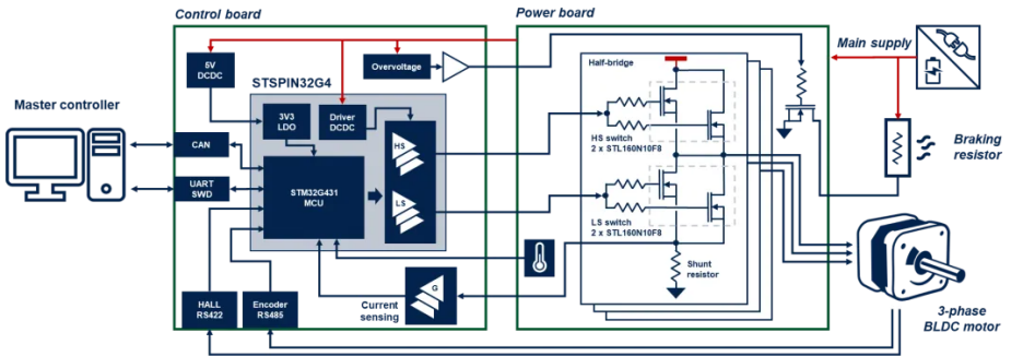 STSPIN32G4是控制板核心(图2),其内置的STM32G431微控制器(Cortex®-M4内核,主频高达170MHz)执行控制算法。