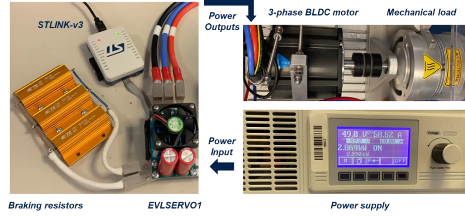 STSPIN32G4配置了实现FOC算法的固件。EVLSERVO1在接近3kW平均功率下运行至极限(图3电源显示值)。