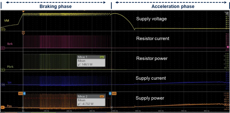 在整个制动阶段,电阻以脉冲模式多次激活,将总线电压钳位在62V–65V安全区间。此过程中脉冲电流达60A,峰值功率约3.4kW,平均功率148W。EVLSERVO1在制动阶段提供约4.7W平均功率为设备内部bulk电容充电,随后电机反转并加速至目标转速,电源功率逐步升至400W。