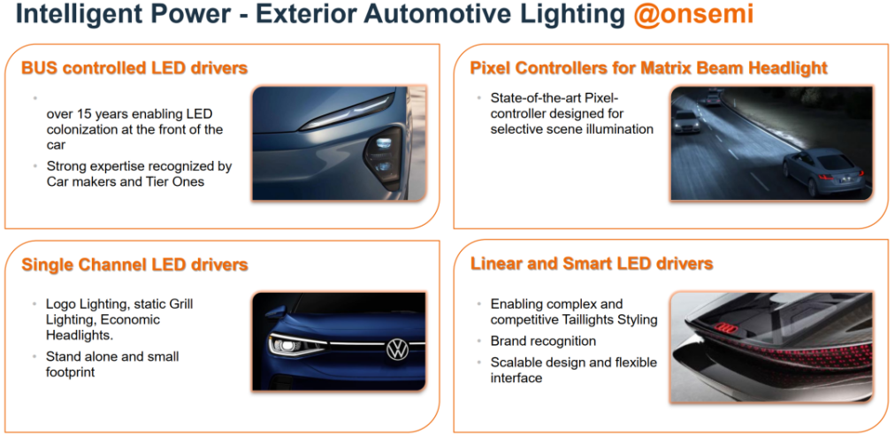 在汽车照明领域,安森美提供覆盖四大类别的完整解决方案,总线控制 LED 驱动器、矩阵光束大灯像素控制器、单通道 LED 驱动器、线性和智能 LED 驱动器。其中在总线控制 LED 驱动器领域,安森美凭借超 15 年经验获车企与一级供应商认可;矩阵光束大灯像素控制器实现先进的选择性场景照明;单通道 LED 驱动器适用于车标灯、静态格栅灯等小体积场景;线性和智能 LED 驱动器赋能复杂尾灯造型,兼具品牌辨识度与可扩展设计。这些方案全方位满足汽车外部照明的多元需求,推动车灯系统智能化升级。