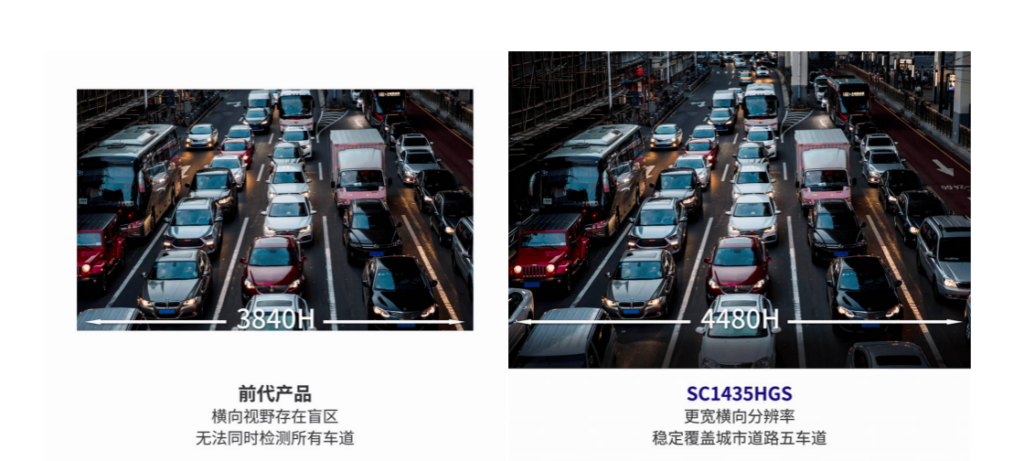 传统的ITS摄像头受限于画幅宽度,在面对城市五车道或含隔离带的宽幅路面时,单台设备通常仅能覆盖部分车道,需要多台设备协同配合才能实现全车道覆盖,因而增加了设备及安装成本。针对这种情况,SC1435HGS采用了4480Hx3072V的优化分辨率比例,进一步提升了画幅宽度。凭借更大的横向画幅,SC1435HGS能稳定覆盖城市五车道及更宽路面,解决因增设绿化带、隔离带或路面拓宽而导致的画面覆盖不全问题,为ITS视觉系统提供更完整的监控视野。