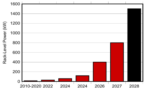 图 1 展示了 IT 服务器机架级电力需求随时间的变化趋势。图 1 预计,到 2028 年单个 IT 机架将需要 1.5MW 的电力,这是当前服务器机架所消耗电力的 10 倍。