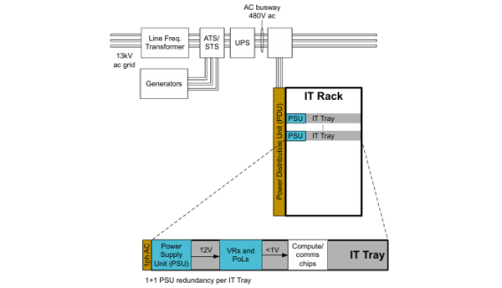将 277VAC 的三相电力输送至 IT 服务器机架后,电源单元 (PSU) 将执行功率因数校正 (PFC) 并生成稳定的 12V 输出,以便分配至服务器 IT 托盘。这种 12V 配电电压适用于第一代架构,为各种负载、电压稳压器和其他负载点稳压器 (PoL) 供电,产生电压以为整个服务器托盘中使用的处理器、存储器和通信集成电路供电。当总机架功率约为 10kW 至 20kW 时,这种架构运行良好。然而,随着对更高计算能力的需求增加,支撑这些计算功能所需的电力也在增加。