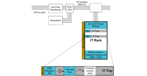 N+1 配置中的每个电源架通常包含六个 PSU,以实现冗余。可通过添加电源架来满足 IT 机架的总电力需求。这些电源架输出 50VDC 总线电压,通过沿服务器机架背面铺设的大电流汇流排分配至各个 IT 托盘。一些第二代装置保留了 UPS 功能,而其他装置会将其移除(如图 3 所示)并替换为本地电池备份单元 (BBU),使 50VDC 总线维持供电,直至电源恢复或备用发电机接管供电。在某些情况下,电容器架或电容器备用单元 (CBU) 有助于消除与任何电源中断相关的过大电压瞬变和电流瞬变。每个 IT 托盘内的 50V 总线连接到本地中间总线转换器,产生为 IT 托盘中系统负载供电所需的 12V 电压。