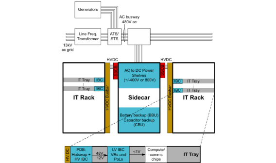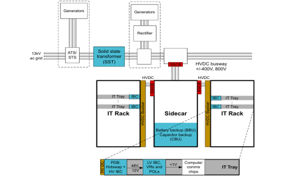 从某种意义上讲,提升 IT 服务器机架的计算密度比解决配电问题更为关键。为了让 AI 发挥最佳功能,基于 AI 的 IT 机架会使用数百个处理器来快速处理所需的计算量。这些处理器需要能够在高密度的封装空间中相互通信。从 IT 机架中移除大部分电源转换功能后,可以在更小的空间内安装更多的处理器。现在,机架中的每个 IT 托盘都以此 800VDC 或 ±400VDC 总线电压作为输入。然后,托盘中的中间总线转换器将该电压转换为 IT 托盘上的配电电压。根据所选架构,配电电压可以是 48V、12V 甚至 6V。
