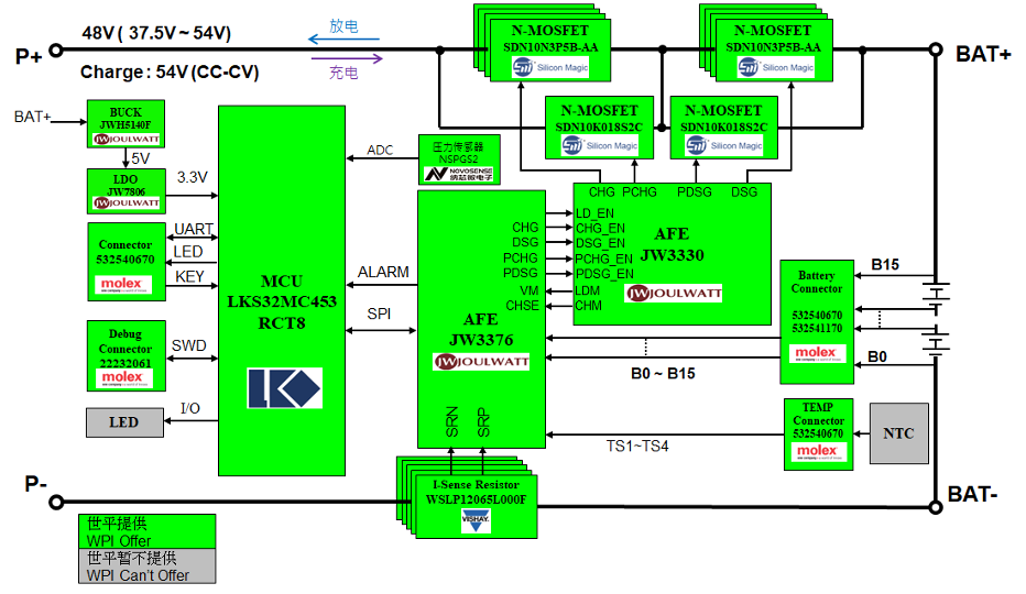 在电源模拟前端的设计中,方案采用的JW3376 AFE器件,其适用于11~16串锂离子、锂聚合物和磷酸铁锂电池组。通过SPI通信,主机控制器可以使用JW3376执行多种电池组管理功能,且芯片内部集成一个14位ADC对电池电压和温度进行采样,同时配备16位ADC用于充电/放电电流采样,能够对电池状态进行精准检测。