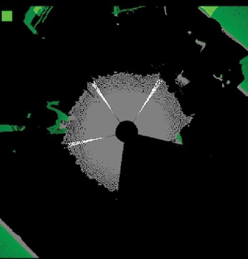 为了实现可视化,传感器将获取的图像转换为顶视图,并根据物体位于安全气泡内部还是外部,用绿色和红色像素标记物体。各传感器也会将此图像作为ROS 话题发布,随后主机将它们合并成组合图像。图6为所有已发布输出图像主题的组合图像。