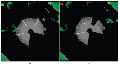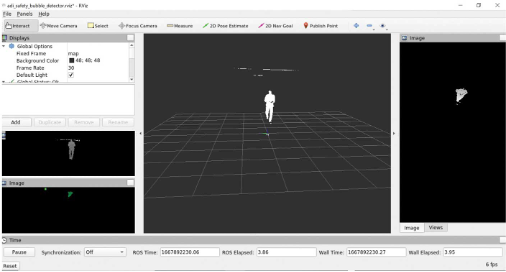 系统采用安全气泡探测算法来探测安全气泡半径内的物体。探测标志以ROS 话题(Topic)的形式传输,主机可以订阅所有模块的话题,并合并各个探测结果。此外,这些模块还可发布深度图像、红外图像和输出图像以供进一步分析。ROS提供了有效的可视化工具,例如rviz,它可以将发布的话题可视化。该应用设计为高度可配置的,将参数传递给ROS节点即可调整摄像头位置、旋转角度和其他配置值。