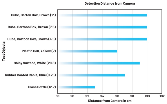 对于透明和低反射物体,ToF传感器的准确度较低。因此,对玻璃瓶和塑料球等物体,会出现探测滞后。例如,图9显示了算法探测到物体的距离(安全半径设置为100 cm)。y轴代表测试对象。玻璃瓶(12, 7)表示玻璃瓶高12 cm,宽7 cm。如果括号中只有一个参数,则它表示物体的半径或立方体的边长。表1总结了安全气泡探测器的规格。
