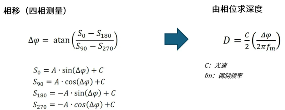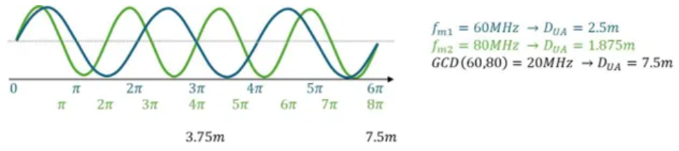 iToF 根据相移来计算距离。相位周期由调制频率决定,相位具有周期性。当与目标的距离超过一个周期时,就会出现相位模糊问题,即无法判断测得的相位属于哪个周期。例如,若调制频率为 60MHz,则一个周期为 2.5 米。在这种情况下,测量距离 3 米将被解释为 0.5 米。因此,最大可测量深度一般在调制频率的一个周期以内(0 至 2π)。