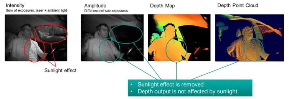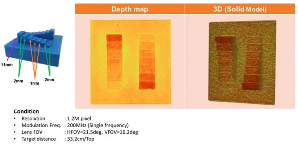 - 增强环境光抑制:一般来说,iToF 容易受到阳光等环境光的干扰。发射激光以外的光源也会影响测量,导致结果不准确。因此,iToF 通常仅限于室内使用。我们的产品增强了环境光抑制能力。即使在阳光下,它也能获得准确的深度结果。